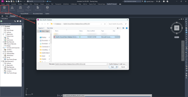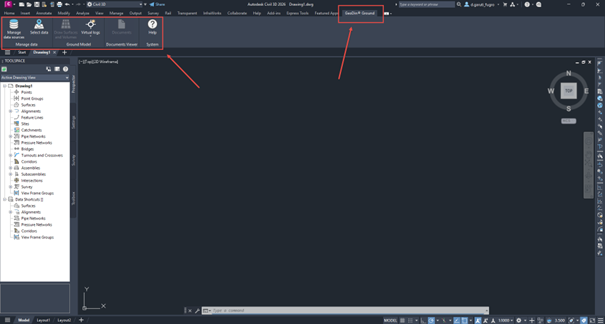 Nach der Installation des Plugins erscheint ein neuer Ribbon-Reiter *GeoDin® Boden* in Civil 3D, der Zugriff auf eine Reihe von Befehlen für die Arbeit mit geotechnischen Daten bietet. Mit diesen Befehlen können Sie eine vorhandene GeoDin-Datenbank auswählen oder verbinden (entweder verbunden oder dateibasiert), Bohrungen zeichnen, Oberflächen und 3D-Körper erstellen und Bohrungsdokumente direkt innerhalb von Civil 3D durchsuchen. Um das Ribbon und seine Funktionen zu verwenden, müssen Sie zuerst eine neue oder vorhandene Zeichnung in Civil 3D öffnen.