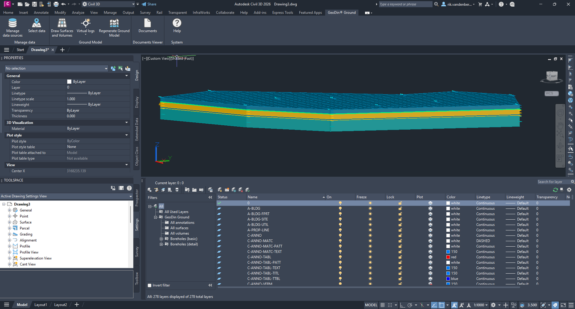 Once you have made your selection, you can press enter to confirm your input. The plugin will then, based on an algorithm that identifies corresponding soil groups based on the layer depths of the surrounding boreholes, create the surfaces and volumes in Civil 3D.